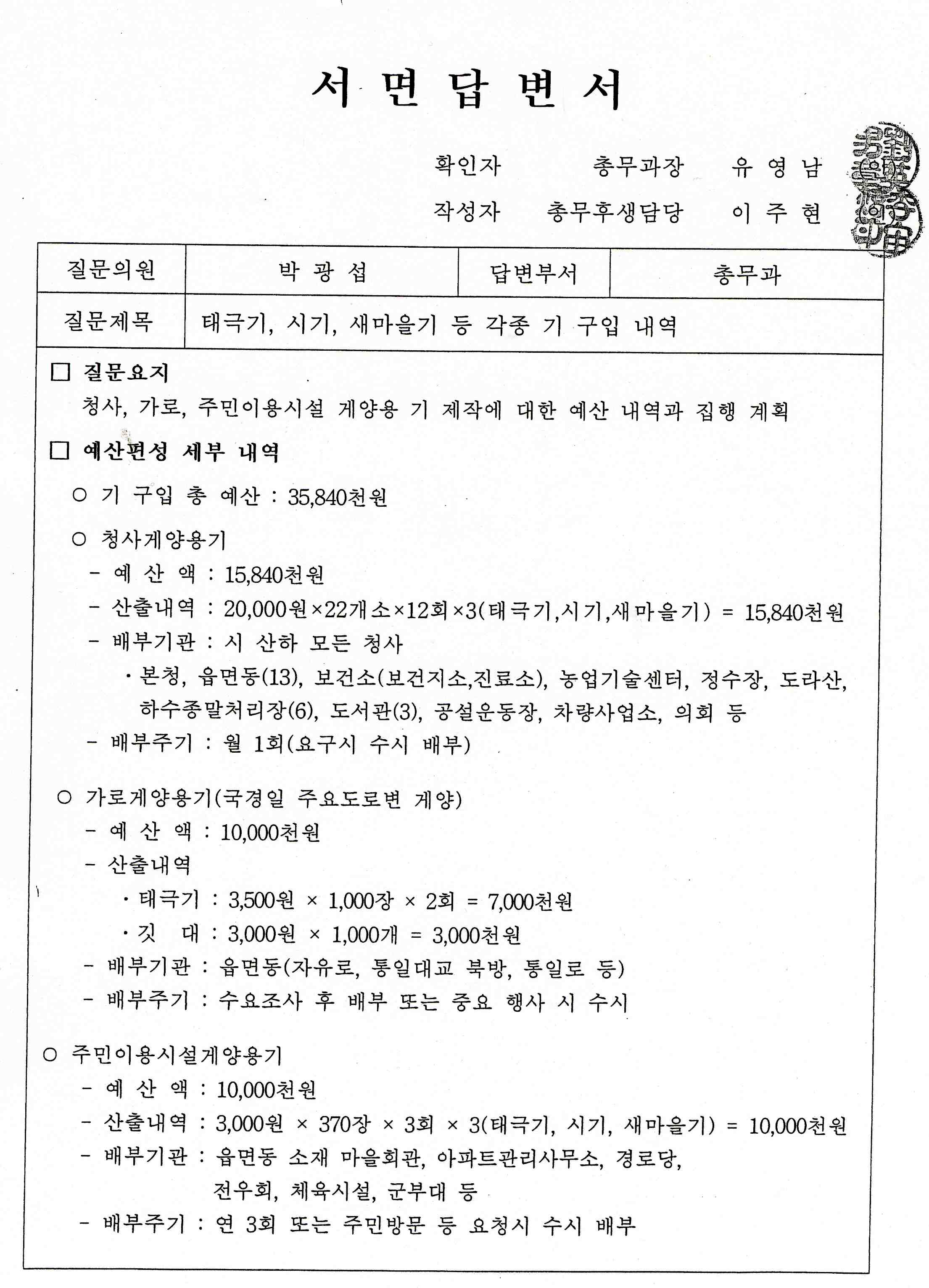 다음은 朴光燮 위원님께서 질의하신 사항 답변 드리겠습니다.