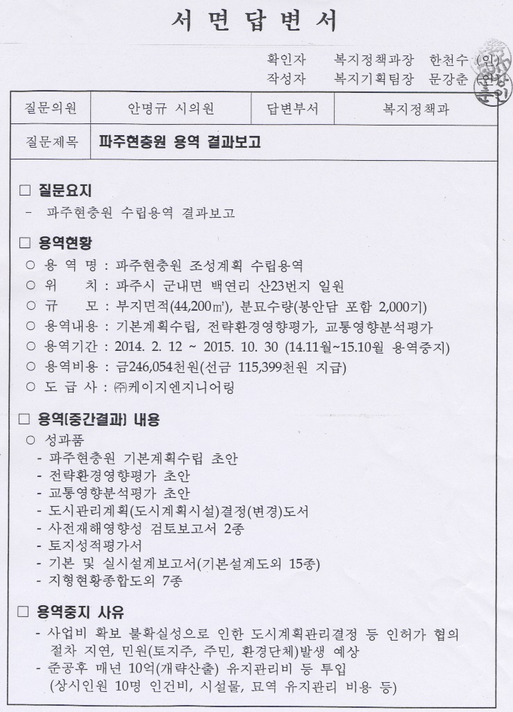 위원님 잘 아시는 바와 같이 파주시는 국토면적이 서울시하고 안양시로 넓습니다, 주내자육원이라고 상당히 현대화되어 있고 시설이 잘 갖춰져 있어서 인근 양주나 동두천 분들이 부럽게 이용하고 있습니다.
