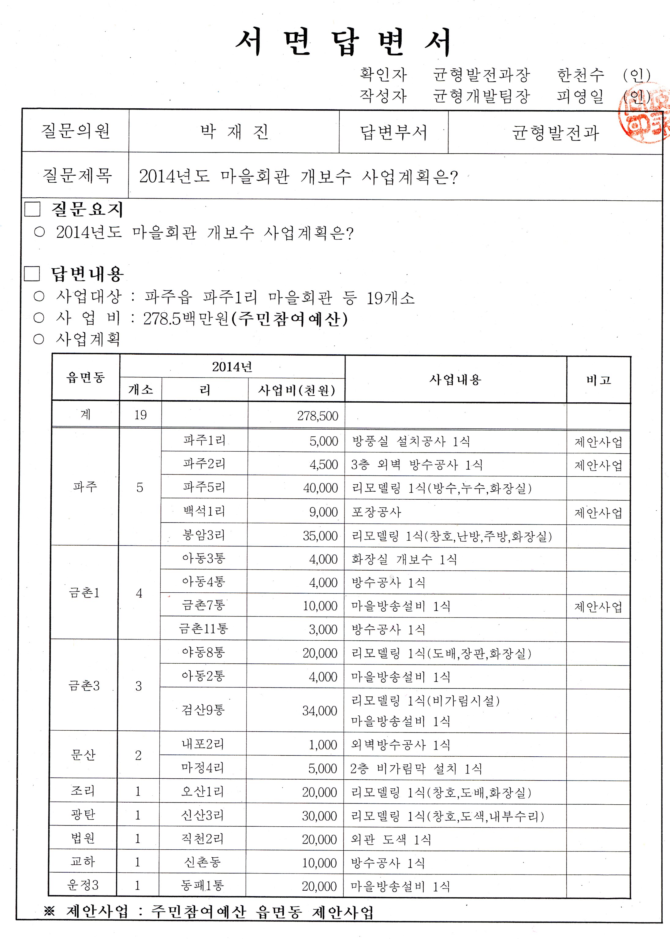 조금 전 박재진 위원님 말씀하신 마을회관 개보수사업에 대해서 또 행정감사시 지적한 사항에 대해서 여쭙겠습니다.