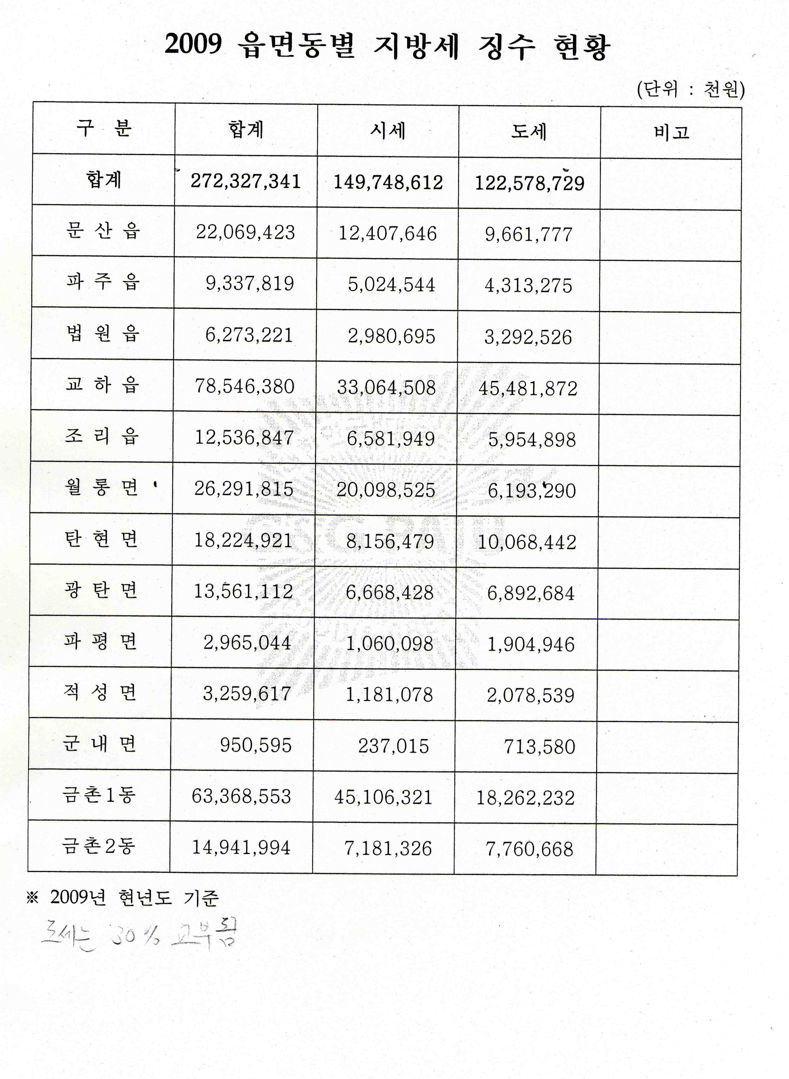 여기에 예산사항이 아닌데 2009년도 지방세 징수결정액과 징수실적, 11월말 현재까지 그것 좀 서면으로 제출해 주시기 바랍니다.