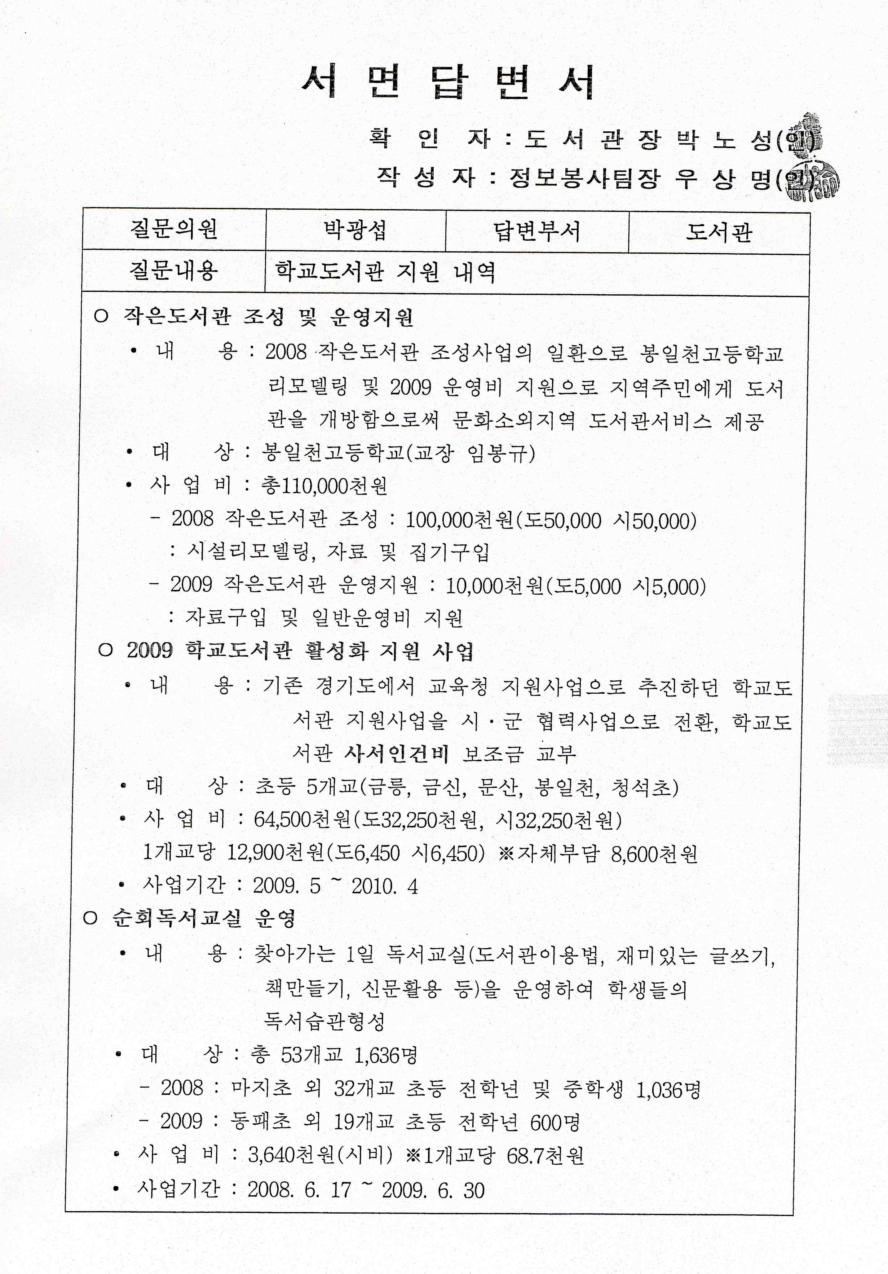 ○ 도서관장 朴魯成 예, 올 9월에 ‘책 읽는 파주’ 선포식을 하고 나면 독서쪽에 예산을 많이 내년에 요구할 겁니다.